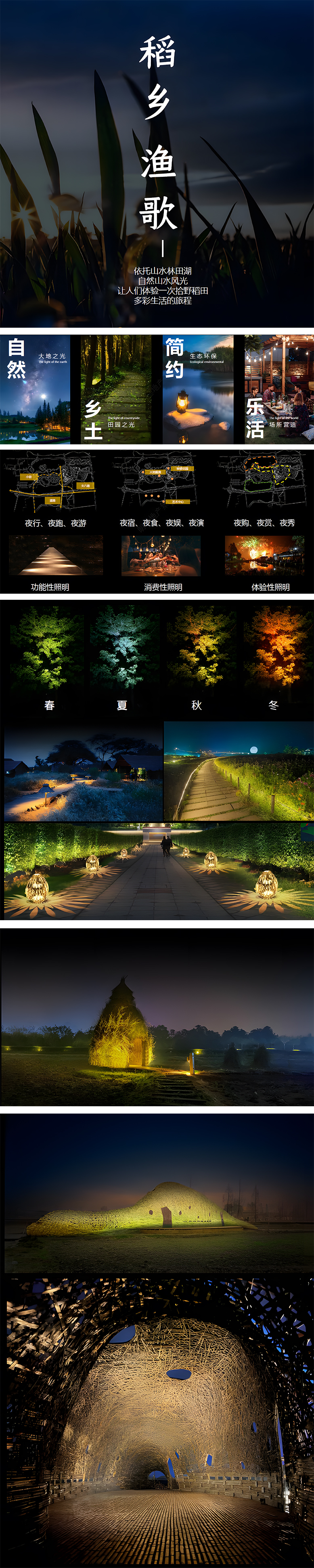 燈光設(shè)計依托項目優(yōu)美的林、園、田、湖等自然風(fēng)光,進行夜游、夜娛、夜食、夜宿等區(qū)域化的業(yè)態(tài)重塑。營造自然、鄉(xiāng)土、簡約、樂活的夜游場景,形成夜間經(jīng)濟閉環(huán),讓人們體驗一次拾野稻田多彩生活的旅程,同時激活了項目的夜間活力。本次設(shè)計也為鄉(xiāng)村振興中夜景燈光設(shè)計提供了一個參考的范本。